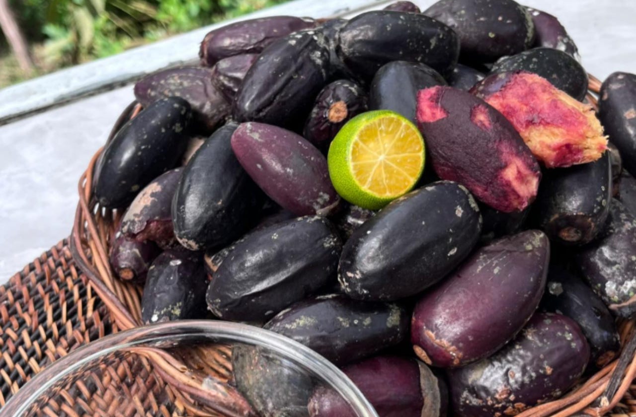 While the world knows the Pili nut primarily as a glaze-covered confection, growing up in Bicol meant knowing it at every stage. As children, we did not just eat the kernel; we also enjoyed the pulp. You see, before the nut reveals its hard shell, it is covered in a thick, purple, black skin and a fibrous pulp. This must be boiled at just the right temperature, or it goes to waste.